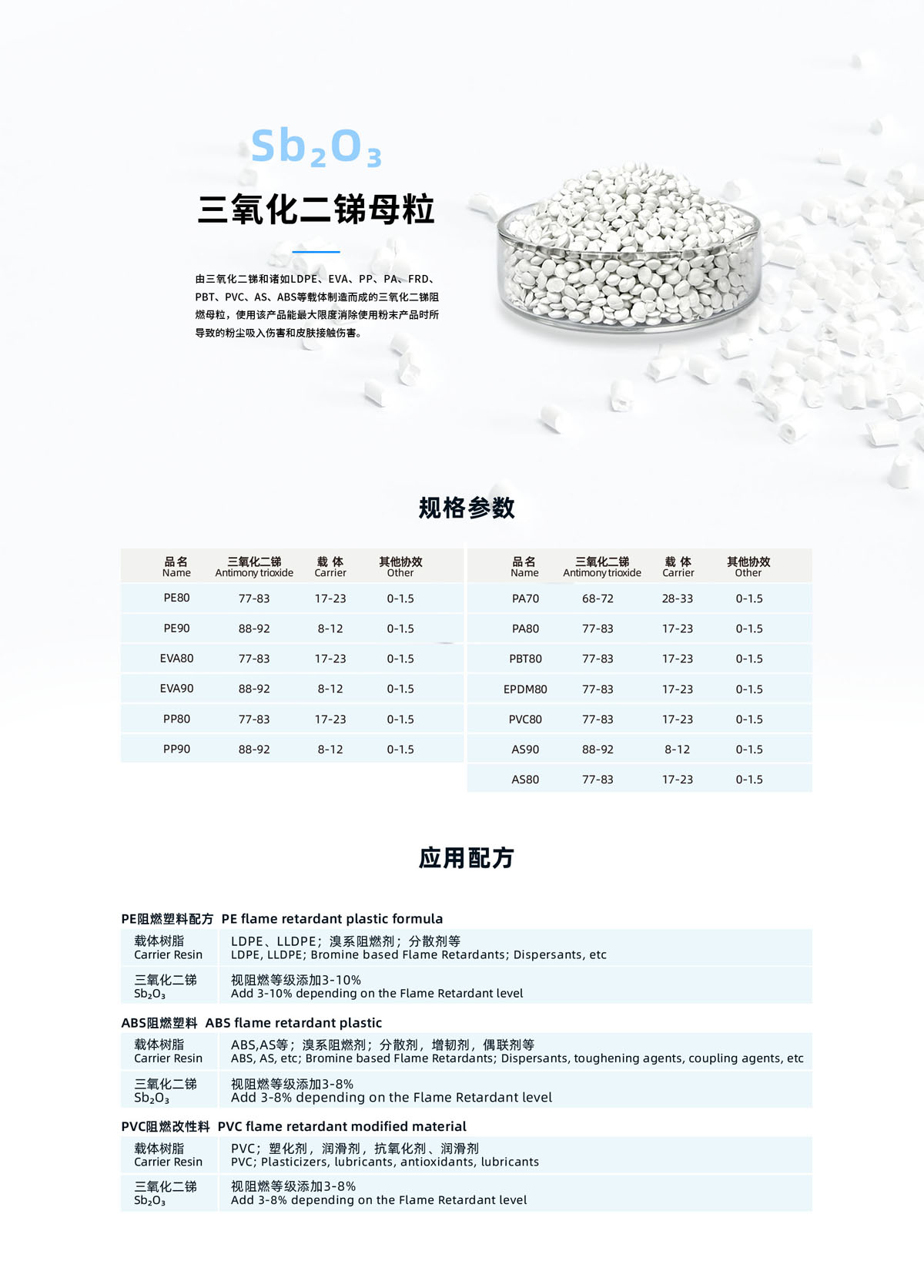 廣泛用于PVC、PP、PE、ABS、PBT、PS、PA、AS等塑料的溴系阻燃協效劑,其與鹵素化合物(如溴、氯)等配合使用可提高阻燃效果,對基材的力學性能影響小,添加少量即可達到UL94 V-0級阻燃標準。