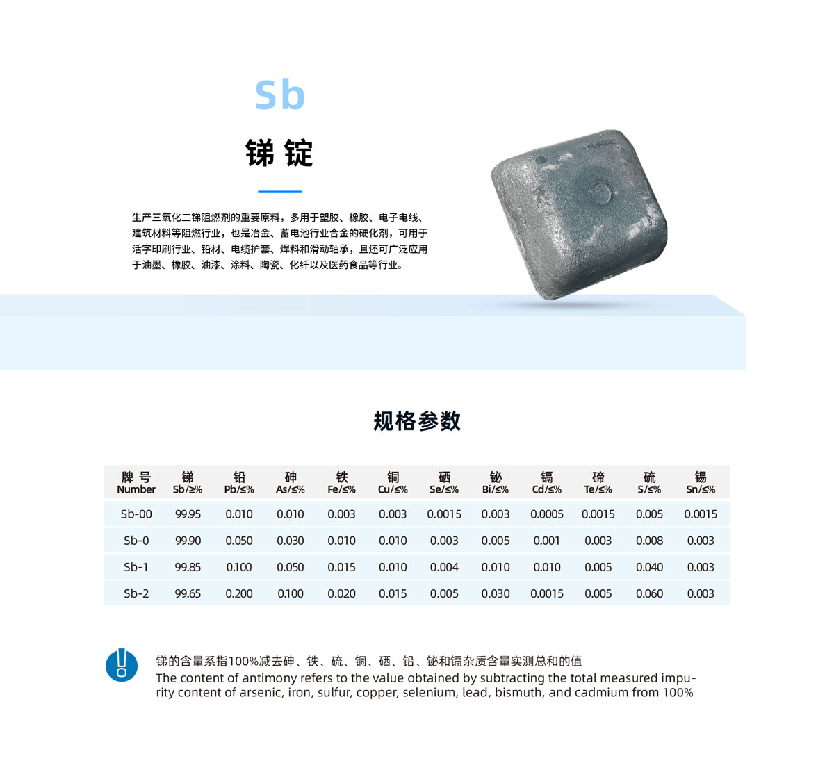 用作塑料、橡膠、油漆、涂料、合成樹脂、紡織、化纖等材料的阻燃添加劑。用于光伏玻璃的澄清劑,以除去熔融玻璃中的隱藏空氣。用作聚酯PET合成縮聚反應的催化劑;用作石油催化裂化和催化重整過程中的鈍化劑。用作搪瓷與陶瓷制品中作覆蓋劑和增白。